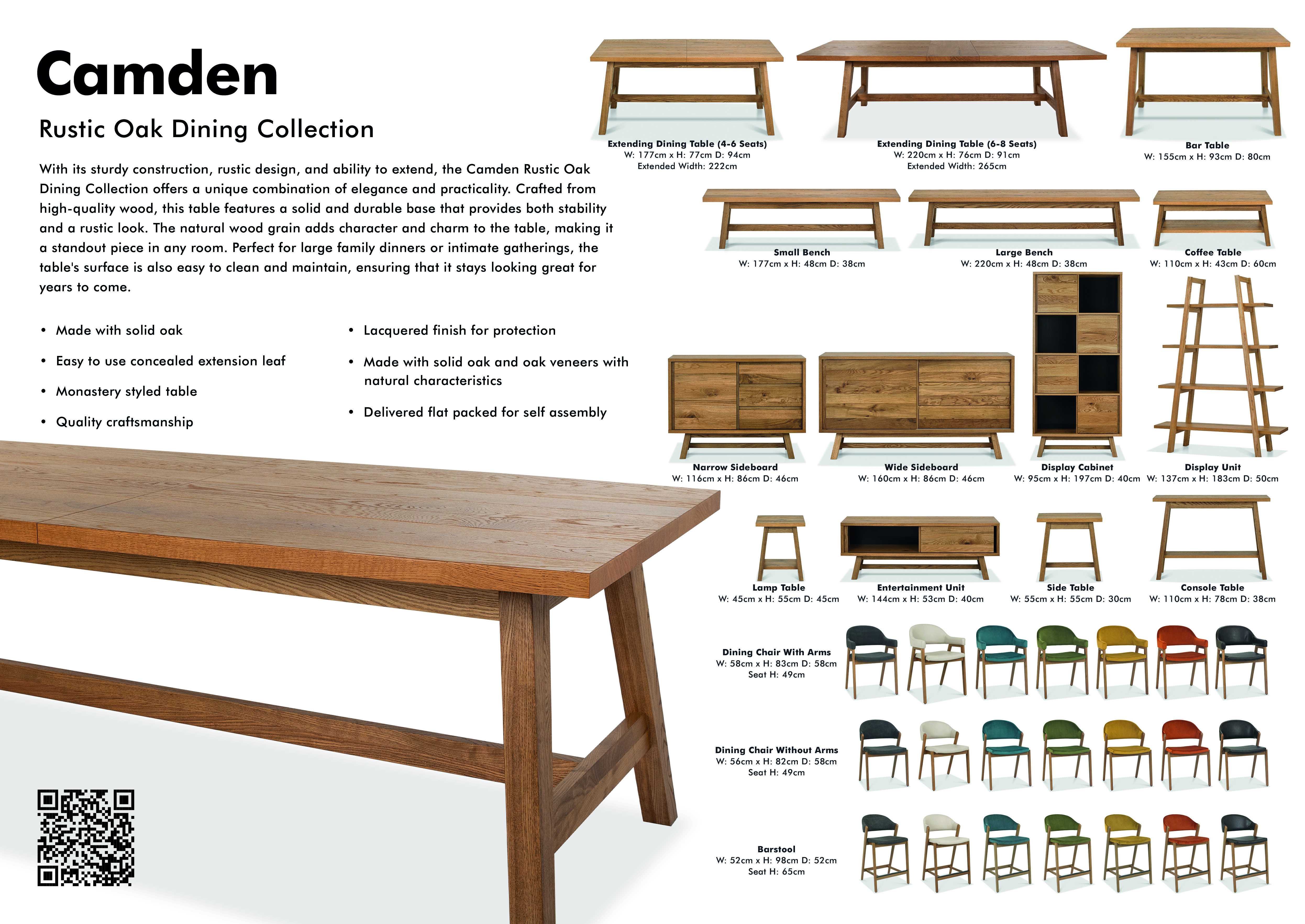 Made with solid oakAvailable in weathered oakMonastery styledQuality craftsmanshipHard-wearingCan be paired with our Camden Rustic Oak Dining TableMade with solid oak and oak veneers with natural characteristicsDelivered flat packed for self assemblyAccidents can happen but we have you covered with our Guardsman 5 year Protection Plan. Click here for Further Information.Also in the Camden Rustic Oak CollectionInterior Design ServiceWhether you're renovating your entire home or updating a room, get expert advice from our team and book an interior design consultation today for only €49!Room DesignerView The Camden Rustic Oak In Room DesignerWant to style it your way? Create your dream home with Room Designer. Choose your colour scheme and add home accessories to plan your space to perfection.Why Buy From Us- NATIONWIDE,