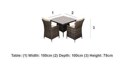 Please write a reviewHow did you feel about your recent purchase? We'd love to hear your thoughts and share them with others!Upgrade your outdoor space with the Elara Square 4 Seat Brown Rattan Garden Set, a perfect blend of style, comfort, and durability. Designed for al fresco dining and relaxed outdoor gatherings, this set features a sturdy square table and four matching rattan chairs, creating an inviting setting for your patio, garden, or decking. Crafted from high-quality weather-resistant rattan, the Elara set withstands varied outdoor conditions, ensuring long-lasting durability without compromising on aesthetics.Product Information