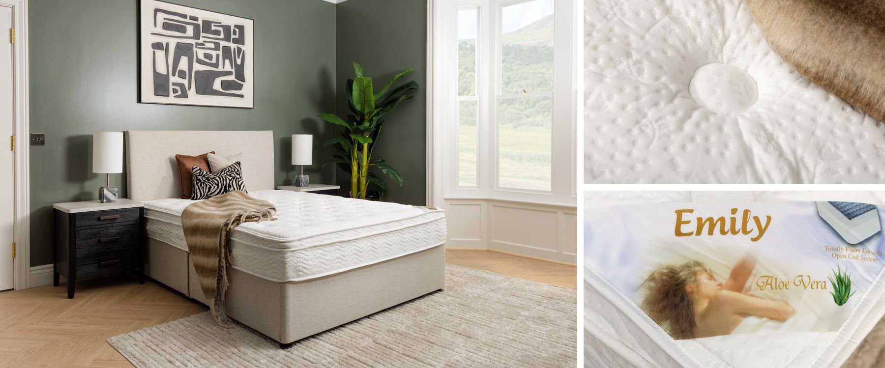 Sizes Available in 3ft single, 4ft small double, 4ft6 standard double, 5ft king size Material Aloe vera enriched fabric Cushioning 25mm super soft foam layer with open coil springs. Frame Fully enclosed open coil system