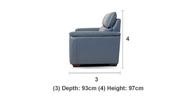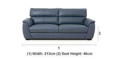 Colors & Sizes Smoke blue leather and Bella grey fabric. Available in 1 seater armchair, 2 seater sofa, 3 seater sofa Material 100% Premium Leather Cushioning Supportive high density foam seat cushions with premium pocket spring and fibre fill cushioning Feet Dark stained oak feet Frame Hardwood and softwood frame construction with expert sinuous spring webbing Features Modern styling