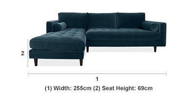 Please write a reviewHow did you feel about your recent purchase? We'd love to hear your thoughts and share them with others!Lounge in luxury on the exquisite Scott Corner Sofa in azure blue velvet and relax on it’s deep, sprung seat and feather-fibre mix cushions. Its clean, square lines offer a subtle nod to mid-century design while it’s sleek silhouette allows it to perfectly complement a range of interiors.Product Information