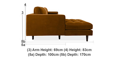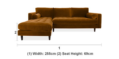 Please write a reviewHow did you feel about your recent purchase? We'd love to hear your thoughts and share them with others!The Scott Cognac Velvet Left Hand Facing Chaise Sofa combines modern design with exceptional comfort, making it an elegant choice for your home. Upholstered in rich cognac velvet crafted from an 85% cotton and 15% polyester blend, it provides a luxurious texture and a durable finish. Its chaise design offers the perfect space to recline and relax, while deep seat cushions with high-density foam cores wrapped in fibre deliver lasting comfort. Two matching bolster cushions are included to complement its sleek look and add support. Built with a strong hardwood and softwood frame, the sofa is supported by dark stained solid wood legs for both stability and sophistication. The left hand facing chaise pairs beautifully with the Scott sofas, armchairs, and footstools, completing the collection with a bold, modern statement.Product Information