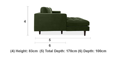 Please write a reviewHow did you feel about your recent purchase? We'd love to hear your thoughts and share them with others!Experience the perfect balance of comfort and style with the Scott Cypress Green Velvet Corner Sofa, featuring a left-hand facing chaise designed for ultimate relaxation. Upholstered in rich, soft velvet, this spacious sofa invites you to sink into its plush cushions while enjoying generous seating. Built with a high-density foam core encased in a fibre wrap, it delivers the ideal combination of lasting support and luxurious comfort. Resting on solid wood feet with a sophisticated dark stain finish, it blends durability with refined design. With its clean lines, sleek silhouette, and vibrant green hue, this corner sofa makes a striking centerpiece that complements both modern and timeless décors. Transform your living space into a stylish retreat with this elegant and versatile piece.Product Information